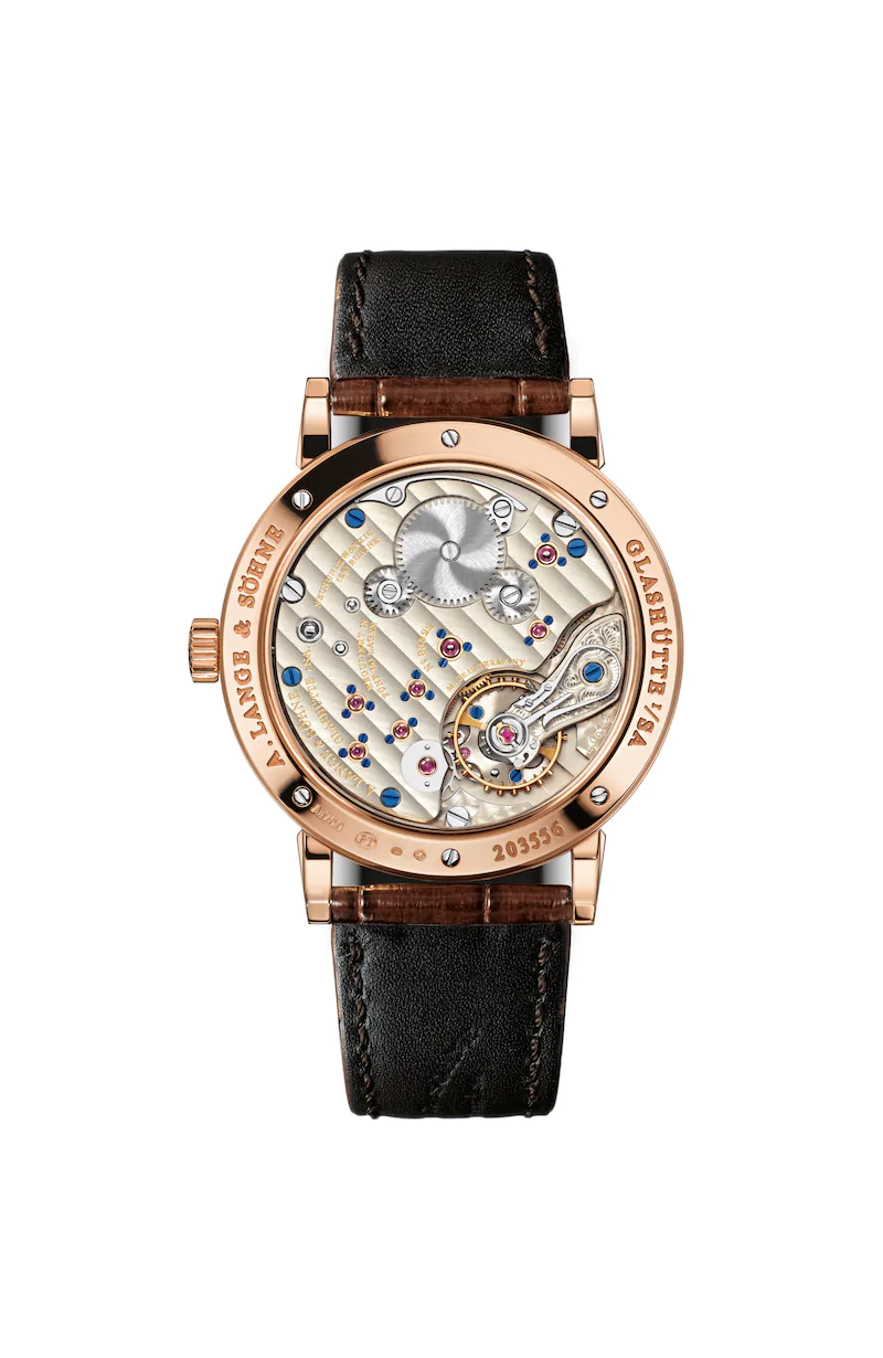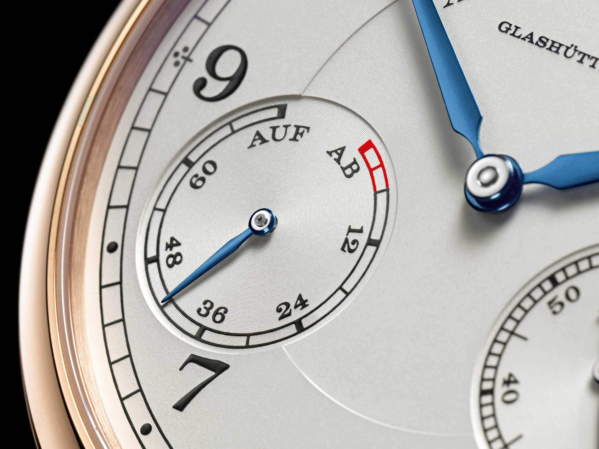 Just like the UP/DOWN power-reserve indicator, the blued hands, the recessed central segment, the Arabic numerals and the railway-track minute scale were inspired by historic pocket watches. A top-mounted wheel train on the caseback side of the movement and two additional screwed gold chatons are manifestations of the mainspring barrel that was enlarged in comparison with the 1815 and delivers power for three days.